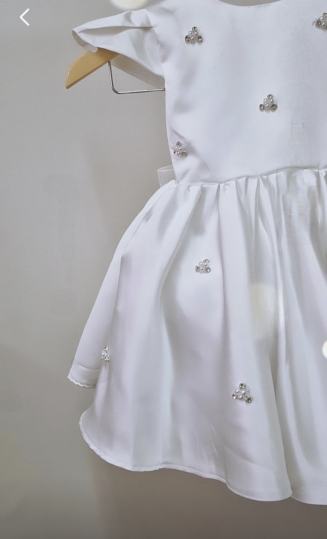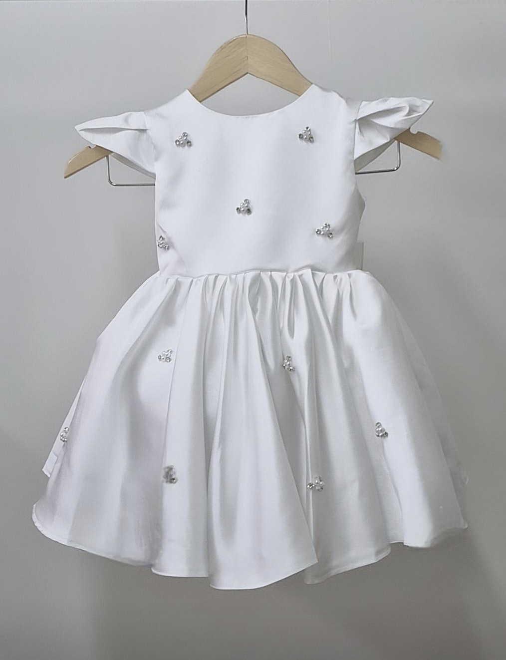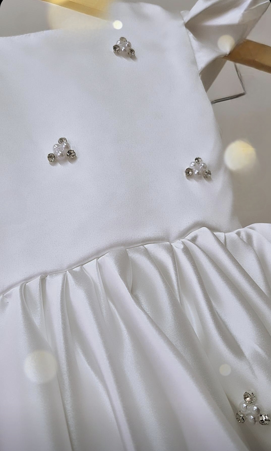 Vestido confeccionado en Satín 100% forrado, con detalles de perlas y cristales